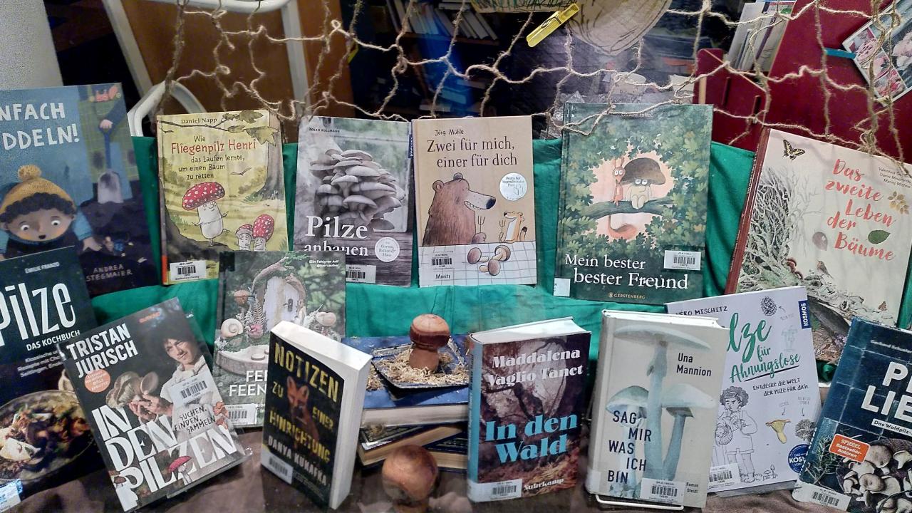 Stadtbücherei Eferding Oktober, 2025 Neues Schaufenster: "Pilze" Es sprießen Pilze jeglicher Art aus dem Schaufenster der Stadtbücherei: aus Kochbüchern, Kinderbüchern, Gartenbüchern, Krimis oder Romanen...